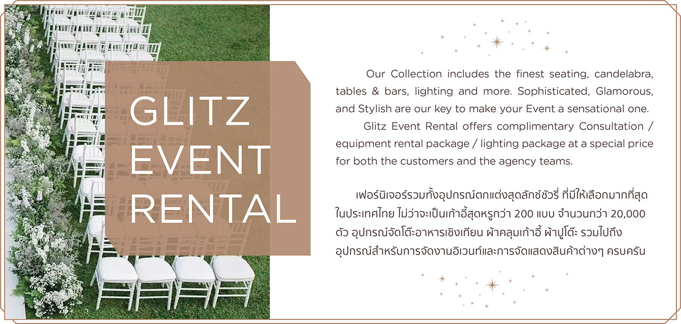 งานสำคัญมิได้เกิดขึ้นทุกๆวัน ด้วยเหตุนั้นความซาบซึ้งของแขกเป็นสิ่งที่ผู้จัดงานนึกถึงมากเป็นลำดับแรกๆไม่ว่าจะเป็นการเลือกเช่าอุปกรณ์จัดเลี้ยง หรือเช่าวัสดุอุปกรณ์ทำพิธีแต่งงาน ทุกอย่างต้องออกมาเพอร์เฟ็คที่สุด และ Glitz Event Rental  เช่าอุปกรณ์จัดเลี้ยง   สามารถเปลี่ยนแปลงภาพฝันของคุณให้เป็นจริงได้ ด้วยบริการให้เช่าเก้าอี้งานสมรส เช่าโต๊ะเก้าอี้งานสมรส เช่าโซฟางานแต่ง รวมถึงเครื่องเรือนสำหรับตกแต่งที่มีหลากหลายสไตล์ให้คุณคัดเลือก
