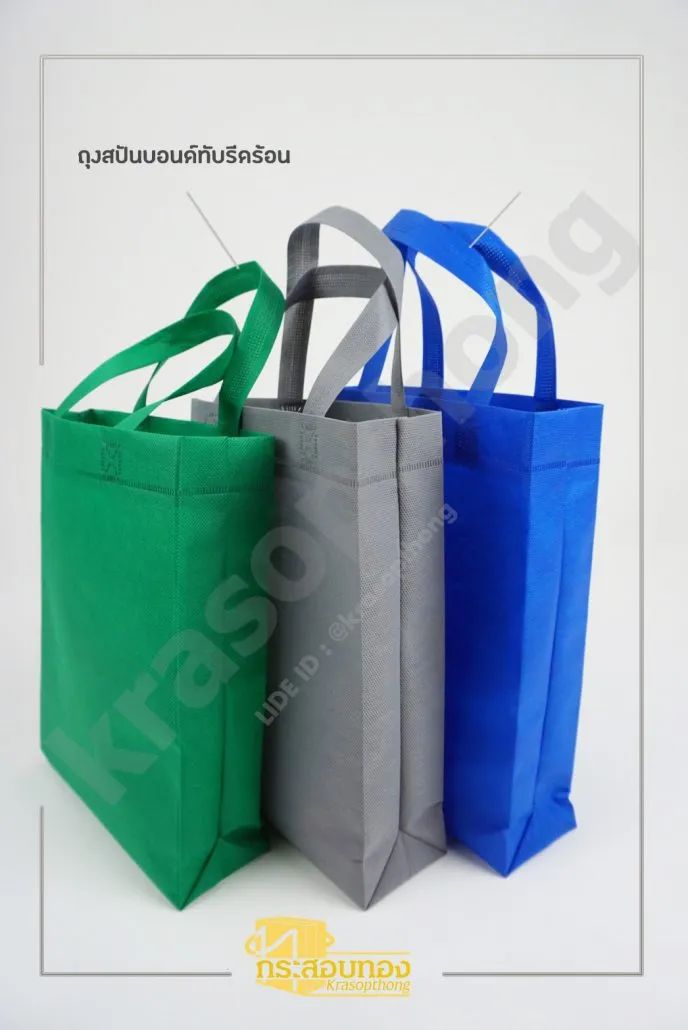 - จุดเด่นของสปันบอนด์แบบรีดร้อน : ราคาย่อมเยาว์ เหมาะกับงานแจกเพื่อทำการตลาด งานออกบูธ ที่เน้นย้ำเรื่องราคาตัวถุงเป็นหลัก สามารถรับน้ำหนักได้ แม้กระนั้นมิได้มากมายเท่างานสปันบอนด์แบบเย็บ สามารถทำเป็นอีกทั้งหูหิ้วและก็หูเจาะ